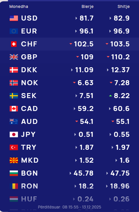 Këtë të premte, një dollar amerikan do të blihet me 81.7 lekë dhe shitet me 83 lekë. Euro blihet me 96.1 lekë dhe do shitet me 96.9 lekë. Franga zvicerane blihet me 102.6 lekë dhe shitet me 103.7 lekë....