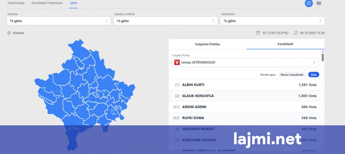 Në Qendrën e Numërimit të Rezultateve është bërë publikimi i numërimit të votave për kandidatët për deputet. Sipas të dhënave nga 13 qendra votimi, që përfaqësojnë 0.51% të totalit të votave, Albin Kurti...