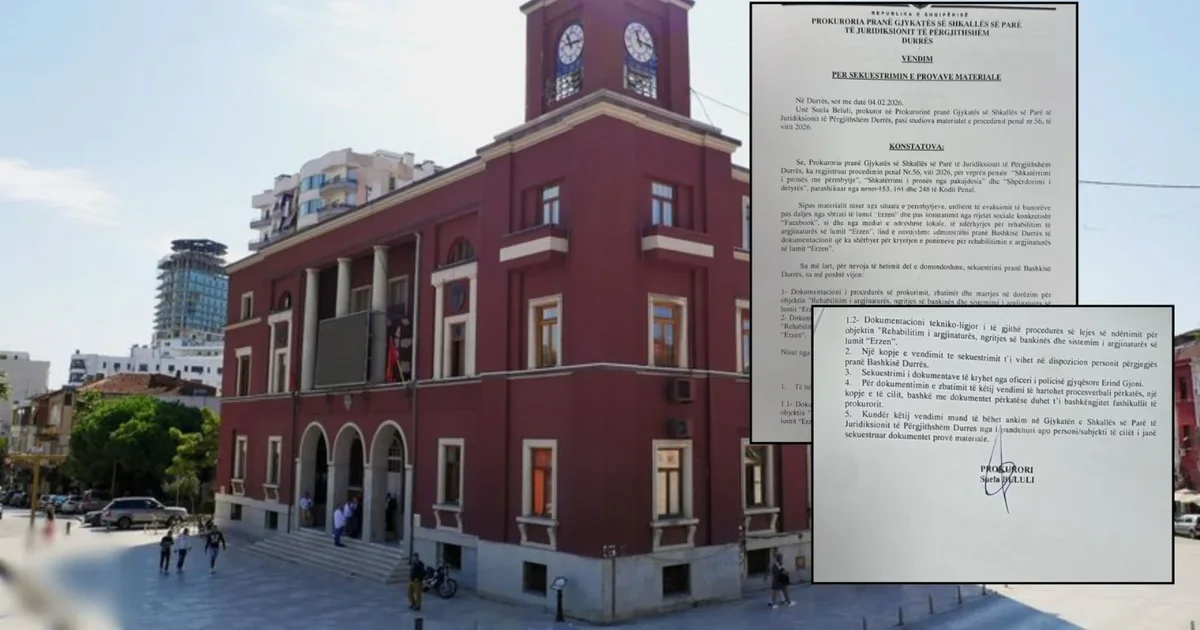 Prokuroria e Durrësit ka vendosur sekuestrimin e dokumenteve që lidhen me projektin për rehabilitimin e argjinaturës së lumit Erzen. Vendimi është marrë më 4 shkurt 2026 me kërkesë të prokurore Suela Beluli,...