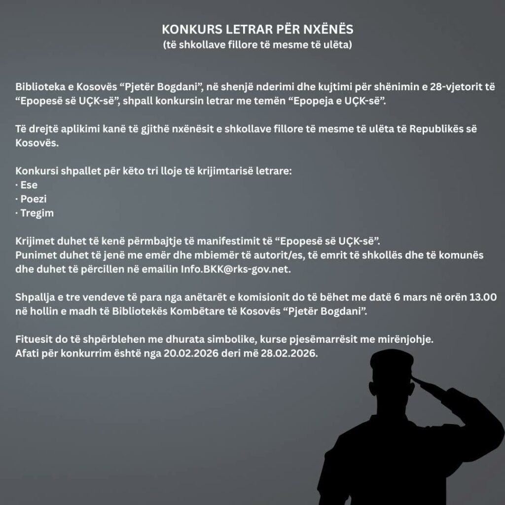 Biblioteka kombëtare e Kosovës “Pjetër Bogdani”, në shenjë nderimi dhe kujtimi për shënimin e 28-vjetorit të “Epopesë së UÇK-së”, ka shpallur konkursin letrar me temën “Epopeja e UÇK-së”. Ky konkurs vlen...