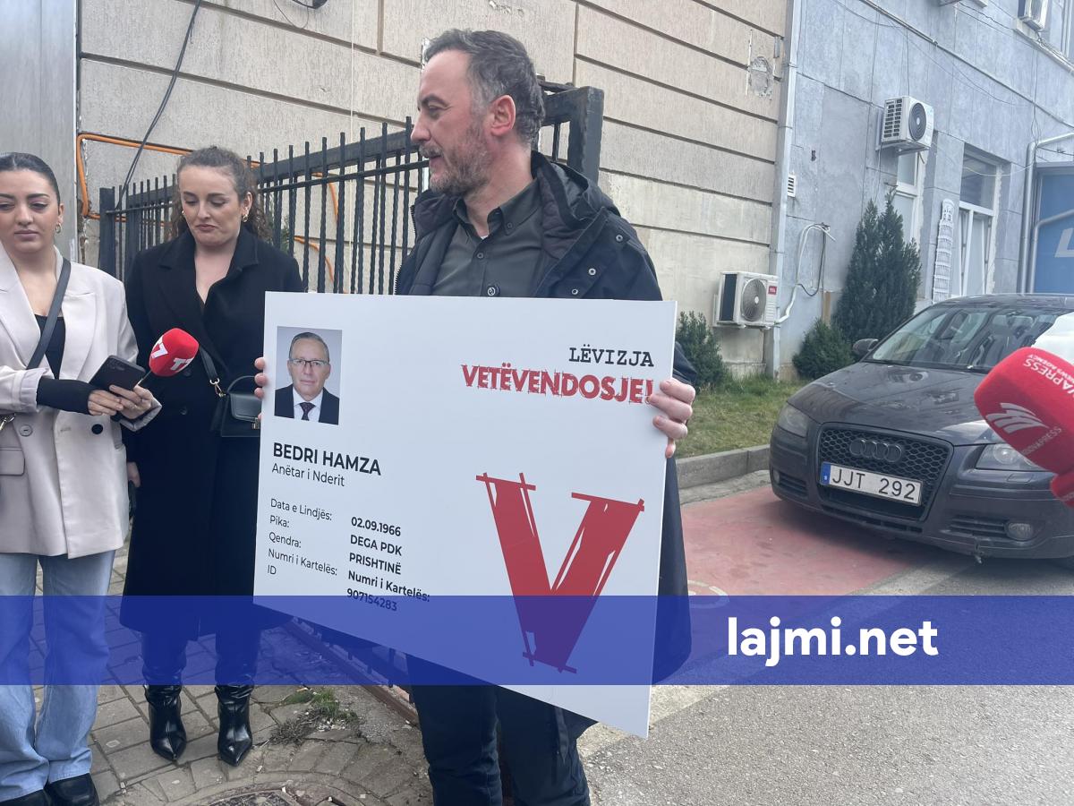 Protesta e PSD’së, e antarësojnë Bedri Hamzën e PDK’së në Vetëvendosje 26 Feb, 13:26 Partia Socialdemokrate (PSD) ka mbajtur aksion simbolik para zyrave të Partisë Demokratike të Kosovës (PDK) të enjten...