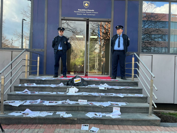 Rinia Demokratike e Kosovës ka zhvilluar një aksion simbolik para ndërtesës së Qeveria e Kosovës, ku në shkallët hyrëse kanë hedhur letra me mbishkrime si “mashtrimet e Kurtit” dhe “Kurti nuk lëshon pe...