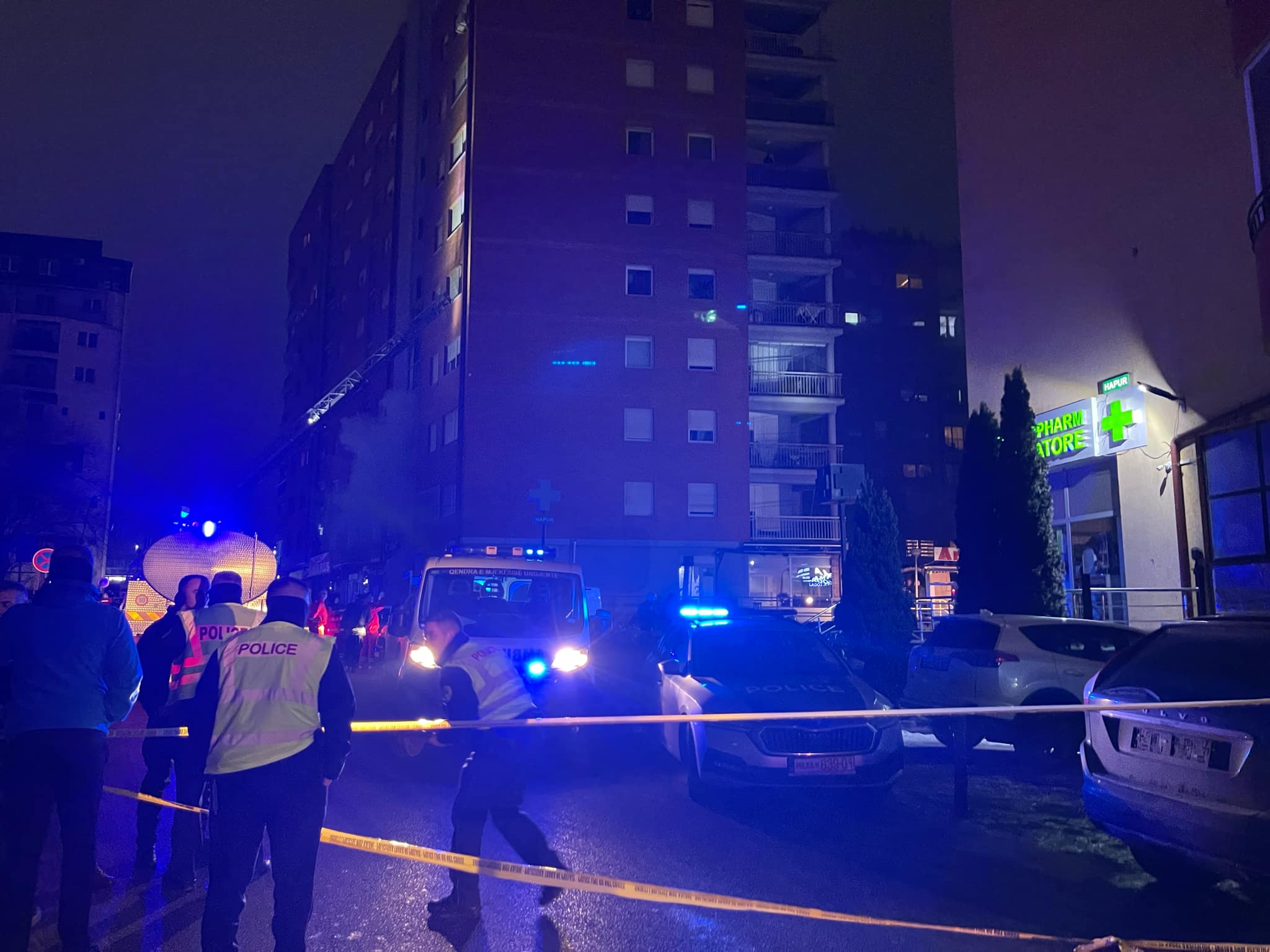 Një ndërtese e “Lesna-s” në lagjen Kalabria në Prishtinë është përfshirë nga zjarri. Në vendin e ngjarjes shihet autoambulanca, policia dhe ekipet tjera të nevojshme. Një banor dëgjohet duke thënë “marum...