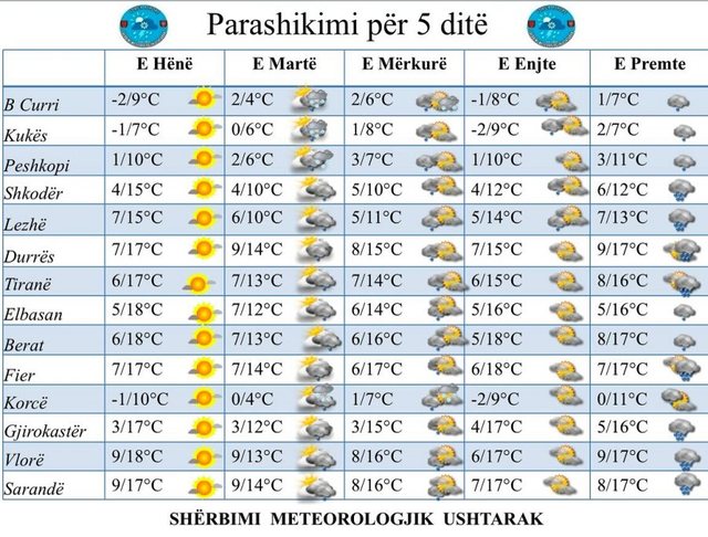 DPHM informoi se nga dita e hënë do të mbizotërojë mot me vranësira të ndryshueshme, ndërsa të martën priten të reshura lokale të shiut dhe në male të borës. Temperaturat maksimale të ditës gjatë javës...