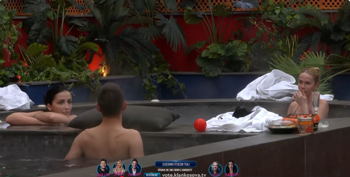 Driloni dhe Xheneta kanë kaluar kohë bashkë në pishinë. Driloni u përpoq t’i thoshte diçka Xhenetës nën zë teksa ‘Vëllai i Madh’ në vazhdimësi i tërhoqi vërejtjen meqë edhe mikrofonat s’i kishin shumë...