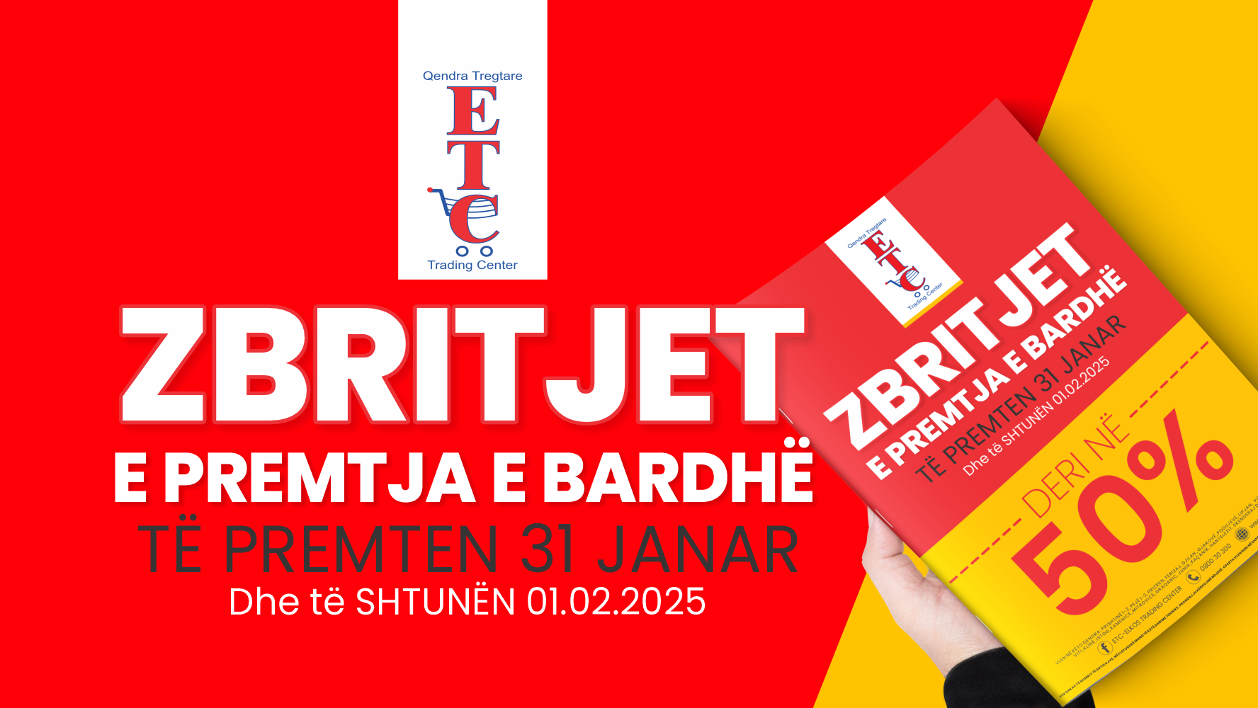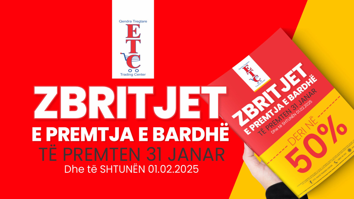 Përzgjedhje e gjerë në shumë artikuj kryesor me çmime të mahnitshme . E PREMTË, 31 JANAR dhe të SHTUNËN 1 SHKURT E PREMTJA E BARDHË është OFERTË e veçantë nga ETC me ZBRITJE DERI 50 % në shumë artikuj Shfleto Fletushkën Online:...