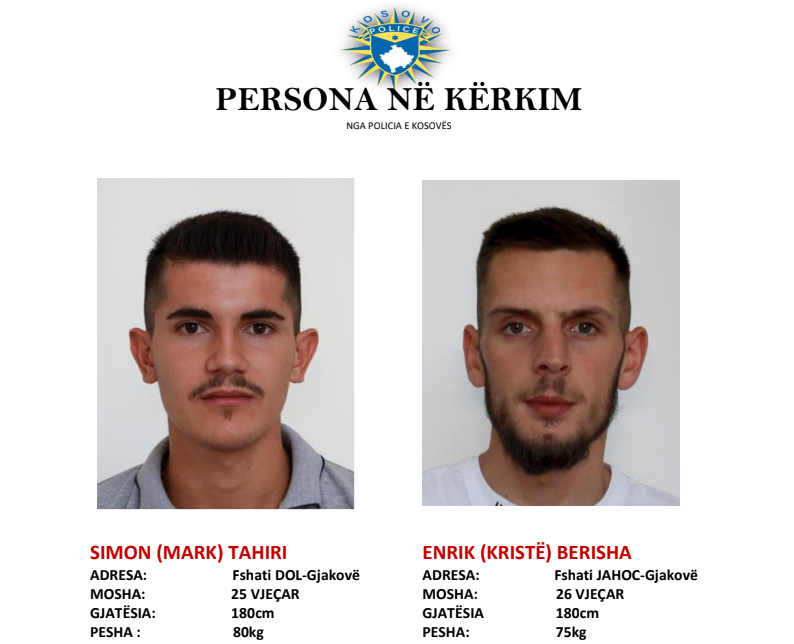 Policia në Gjakovë ka shpallur në kërkim dy të dyshuar, për një rast të vrasjes në tentativë. Simon Tahiri, 25-vjeçar, dhe Enrik Berisha, 26-vjeçar, po kërkohen për vrasje në tentativë më 20 janar. Policia...