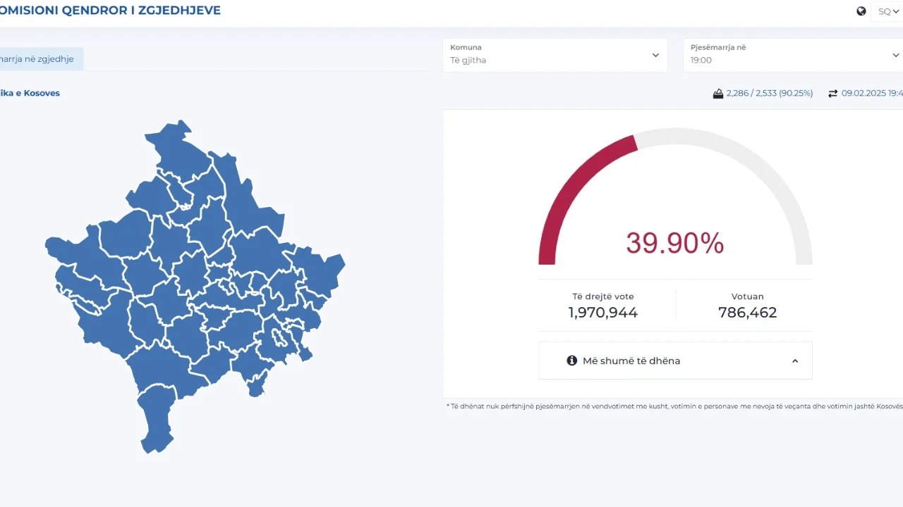 Deri më tani janë procesuar 2,286 nga 2,533 apo 90.25%. Sipas KQZ-së, deri më tani dalja në zgjedhje ka arritur në 39.90%, raporton Zeri.info. Sipas kësaj nga 1,970,944 qytetarë me të drejt vote, 786,462 kanë votuar. /Zëri