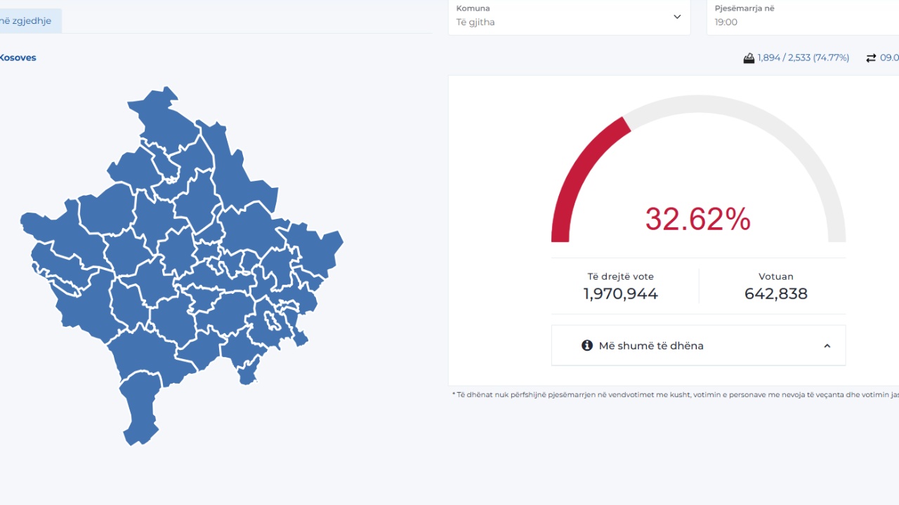 Komisioni Qendror i Zgjedhjeve ka përditësuar të dhënat për numrin e votuesve sot në Kosovë, ku po votohet për zgjedhjet parlamentare, raporton Gazeta Blic. Sipas të dhënave të KQZ -së, deri në ora 19:00...