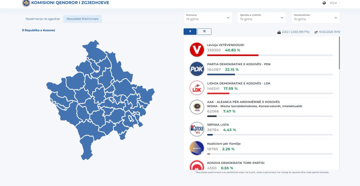 Më 9 shkurt qytetarët e Kosovës iu drejtuan kutive të votimit. Nga rezultatet preliminare nga KQZ, Vetëvendosje është partia e parë me 40.83 për qind, PDK partia e dytë me 22.15 për qind, LDK e treta me...