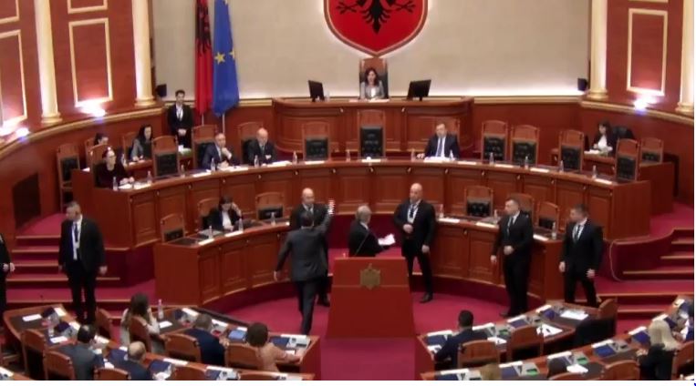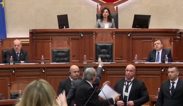 Berisha bllokon foltoren, ndërhyn Garda. Si pasojë e këtyre tensioneve të shkaktuara në Kuvend, kryetarja Elisa Spiropali ka ndërprerë serancën. Spiropali: 5 minuta pushim.
