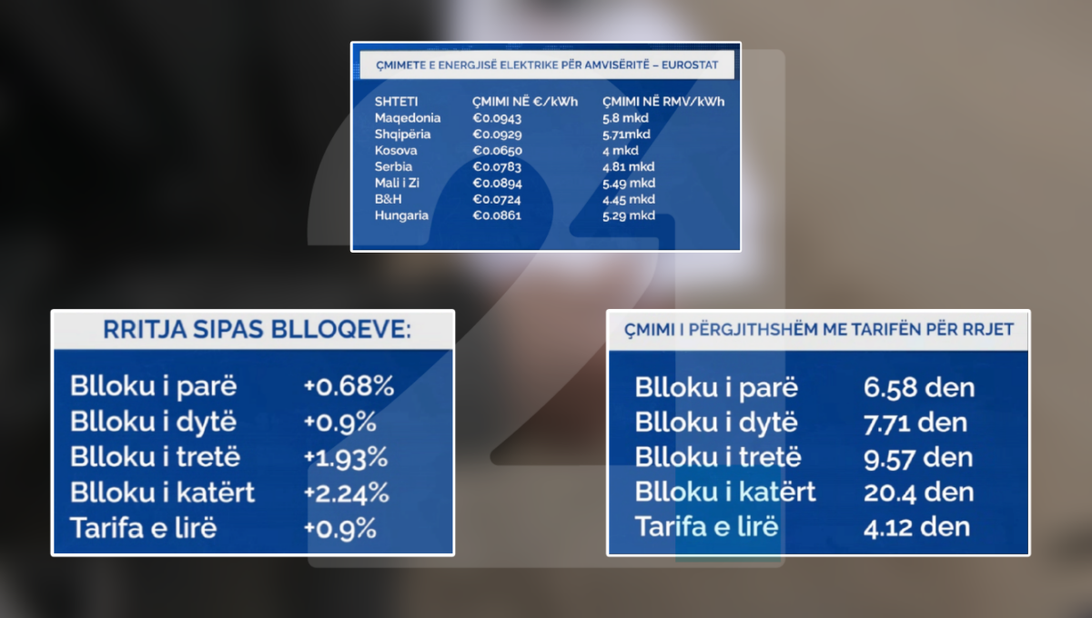 Sipas të dhënave të fundit, për vitin e kaluar, të publikuara nga EUROSTAT-i, në Maqedoninë e Veriut rryma elektrike për amvisëritë është më e shtrenjta në rajon, me çmim mesatar prej 6.08 denarë për kilovat-orë....