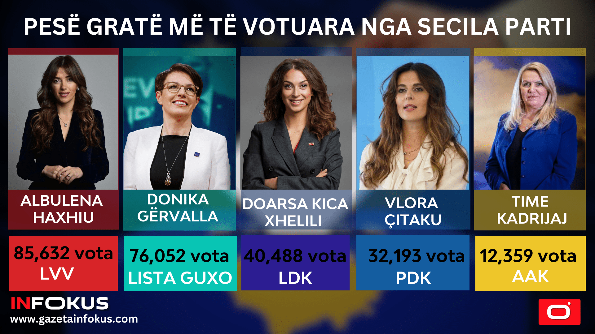 Gratë më të votuara në vend: top 5-shet e secilës parti 20 Feb, 10:23 Albulena Haxhiu është gruaja më e votuar në Lëvizjen Vetëvendosje dhe në mbarë vendin në zgjedhjet parlamentare të 9 shkurtit. Me shumicën...