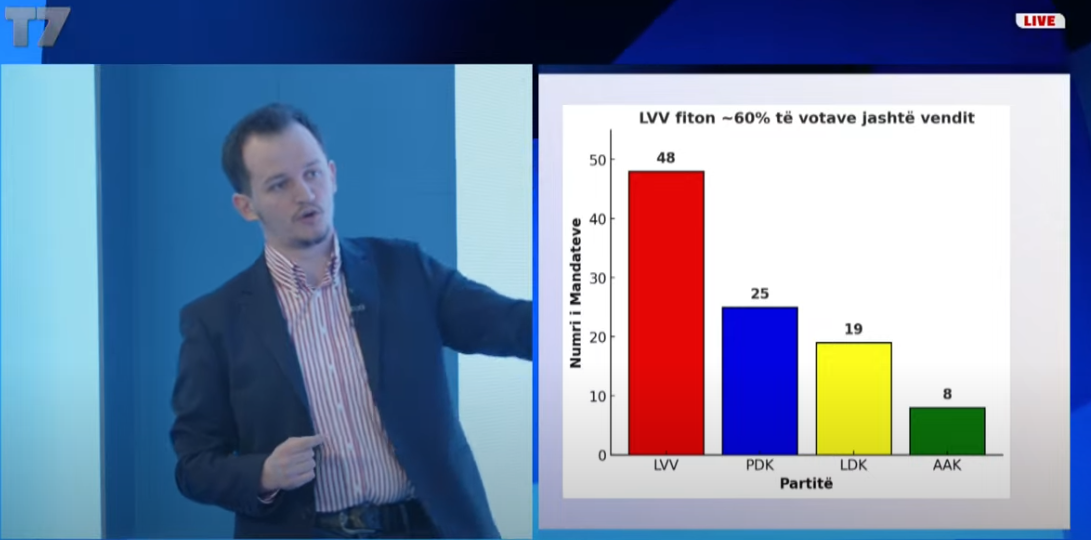 Albert Krasniqi nga Demokracia Plus ka thënë se Vetëvendosje do të marrë 47 ulëse në legjislaturën e nëntë, prej tyre do të jenë 28 burra dhe 19 gra. Ndërsa sipas Krasniqit PDK do të ketë 25 deputetë –...