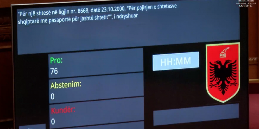 Kuvendi miraton pa opozitën ndryshimet në Aktin Normativ. Me 76 vota pro, u miratua Akti normativ nr.1 “Për një shtesë në ligjin nr.8668, datë 23.10.2000, “Për pajisjen e shtetasve shqiptarë me pasaportë...