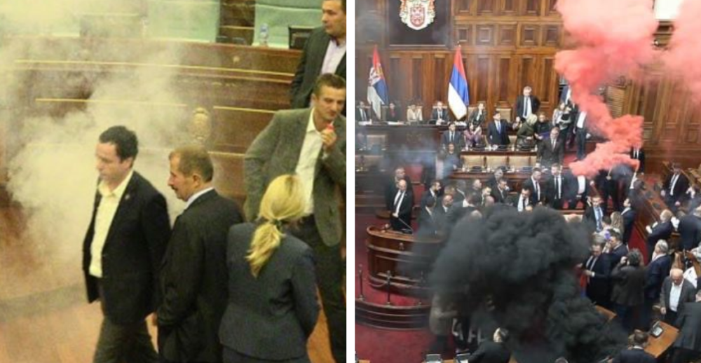 Parlamenti i Serbisë u mbulua sot nga tymi i granatave të hedhura gjatë seancës së sotme nga deputetët e opozitës. Deputetët e opozitës serbe hodhën granata tymuese brenda parlamentit në shenjë proteste...