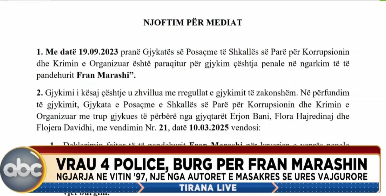 Gjykata e Posaçme ka dënuar përjetë Fran Marashin i që akuzohet për ngjarjen e njohur si “Masakra e Urës Vajgurore”, ku u vranë 5 punonjës policie. Njoftimi: 1. Me datë 19.09.2023 pranë Gjykatës së Posaçme...