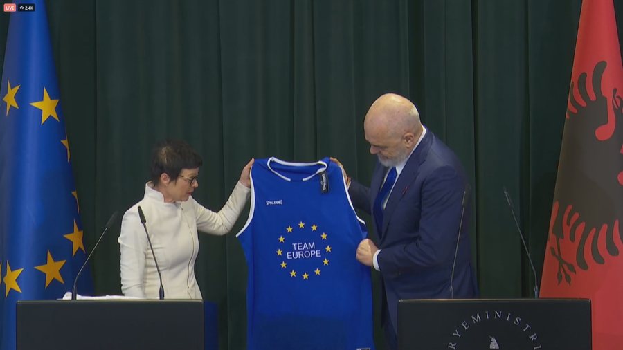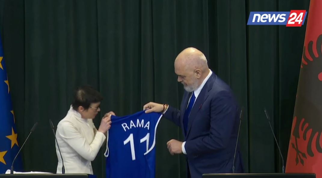 Kryekomisionerja për Zgjerimin, Marta Kos, në konferencën e përbashkët me kryeministrin Rama, i ka dhuruar atij një fanellë basketbolli me numrin 11 dhe me stemën e Bashkimit Europian, në të cilën shkruhej...