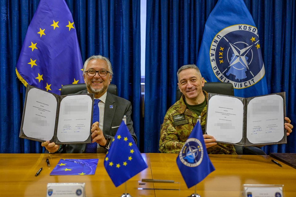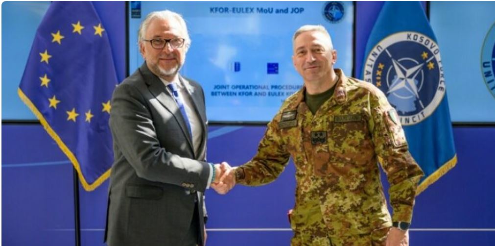 Sot, komandanti i KFOR-it, gjeneralmajor Enrico Barduani dhe shefi i EULEX-it, Giovanni Pietro Barbano, nënshkruan Procedurat e Përbashkëta Operative të rishikuara ndërmjet KFOR-it dhe EULEX-it, bashkë...