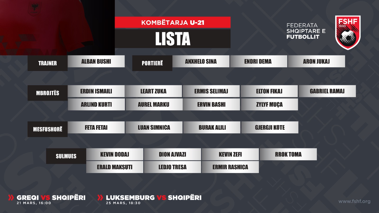 Kombëtarja shqiptare U-21 do të zhvillojë dy ndeshje miqësore në transfertë ndaj Greqisë dhe Luksemburgut. Kuqezinjtë nisin të hënën grumbullimin për këto sfida, ndërsa trajneri Alban Bushi ka publikuar...