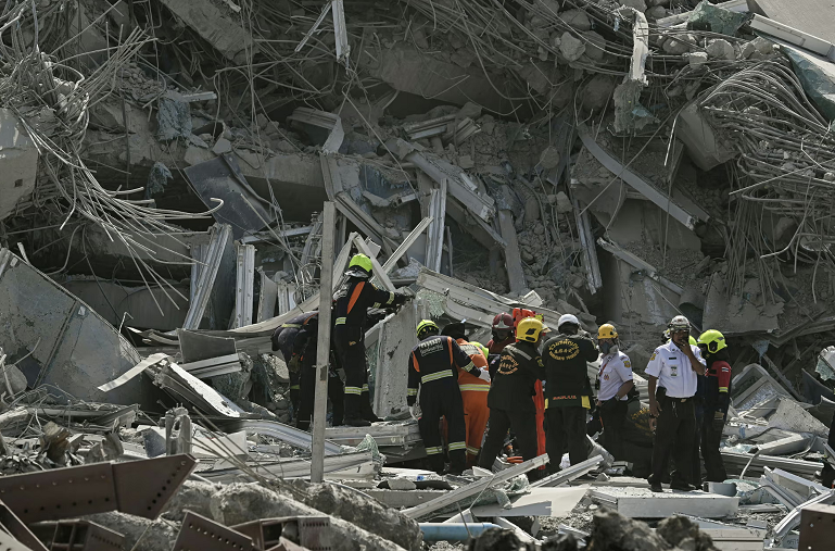 Rescuers work at the site of a collapsed building after the tremors of a strong earthquake that struck central Myanmar on Friday affected Bangkok, Thailand, March 28, 2025. REUTERS/Ann Wang Një tërmet...