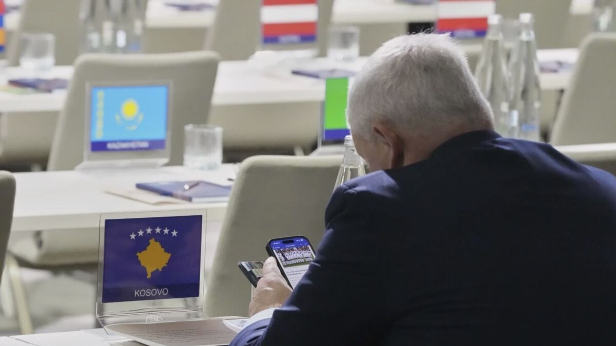 Në një fotografi të publikuar nga Associated Press, shihet dikush nga Këshilli Organizativ, teksa heq simbolet e Kosovës nga Kongresi i UEFA-s që po mbahet në Beograd. Në këtë Kongres i pranishëm është...