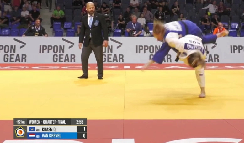 Distria Krasniqi ka kaluar në gjysmëfinale të Evropianit në Podgoricë. Distria e mposhti bindshëm holandezen Naomi Van Krevel. Ndaj saj mori shpejt pikē e mē pas fitoi me Ippon të bukur.