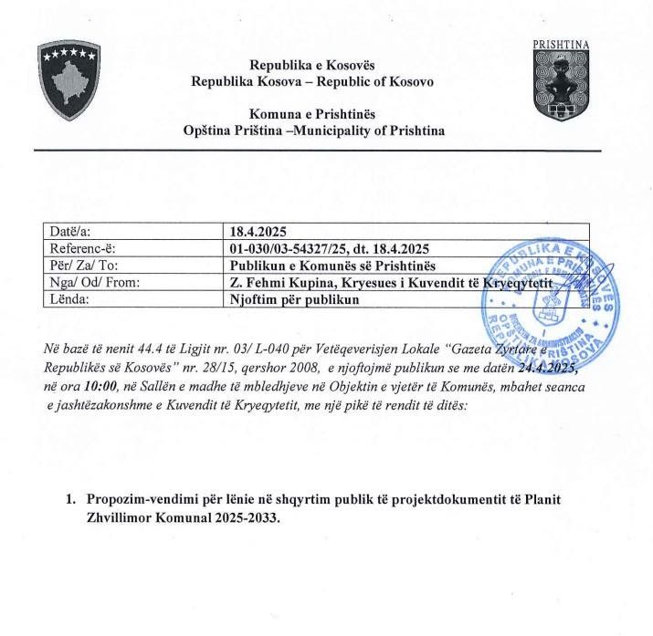 Kuvendi Komunal i Prishtinës mbanë sot seancë të jashtëzakonshme. Pika e rendit të ditës është propozim-vendimi për lënie në shqyrtim publik të projekt-dokumentit të Planit Zhvillimor Komunal 2025-2033....