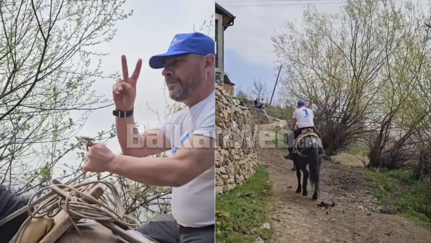 Pas incidentit të dhunshëm në Ostren të Bulqizës, drejtuesi politik i PD-së në Dibër, Xhelal Mziu, i cili kandidon edhe për deputet në këtë qark, është shfaqur mbi kalë. Me dy gishtat lart, Mziu shprehet...