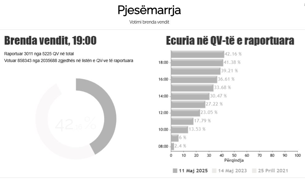 Procesi zyrtar i votimit në zgjedhjet parlamentare 2025 ka përfunduar në orën 19:00 në të gjithë vendin. Sipas të dhënave të KQZ, pjesëmarrja në të gjithë vendin ishte 42.16%. Qarku me përqindjen më të...