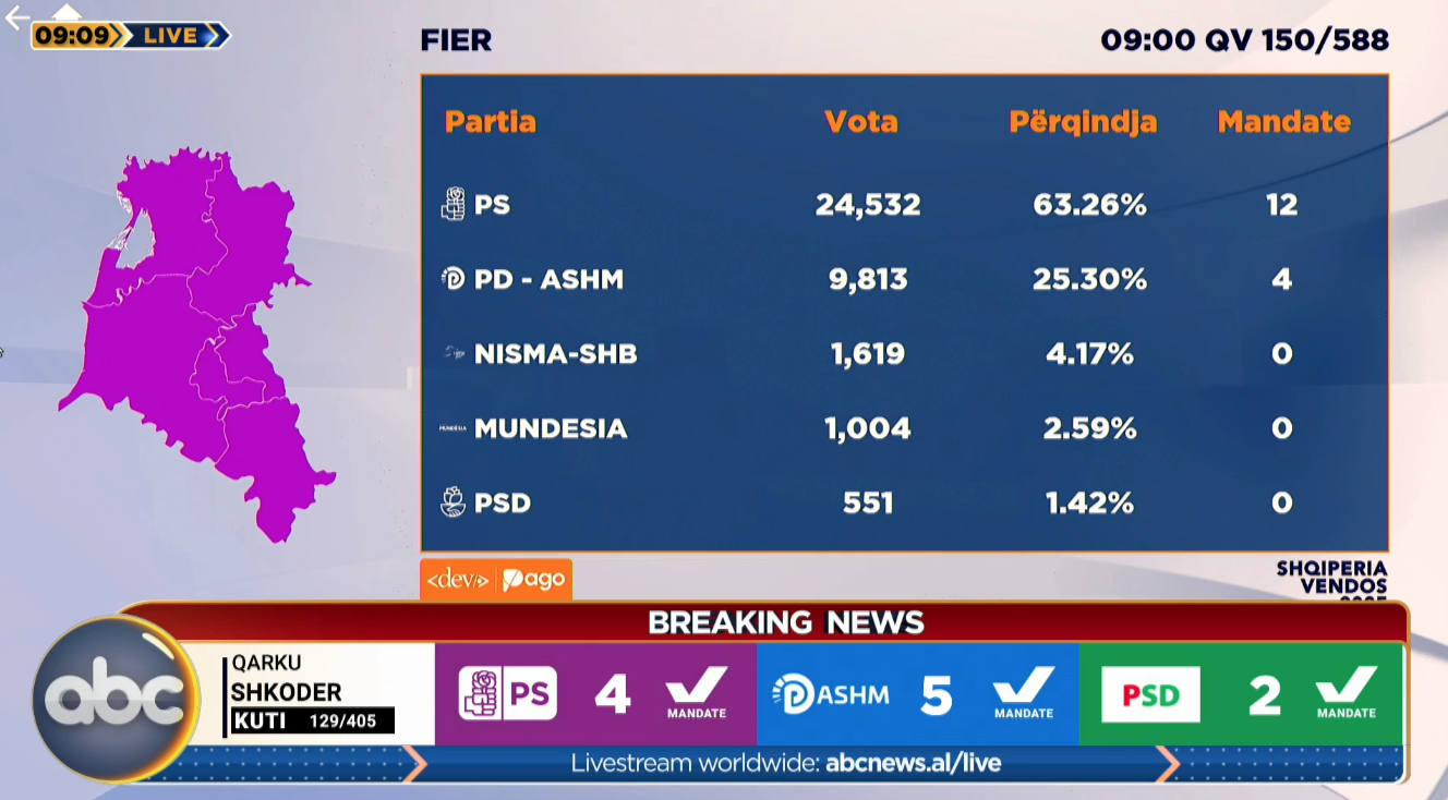 PS kryeson bindshëm në Fier. Sipas të dhënave më të fundit, nga 135 kuti të numëruara nga 588 në total, PS ka marrë 63.4% të votave, 22 178 vota, kundrejt 8 801 të PD-ASHM, 25.2% të votave. Në këto ritme,...