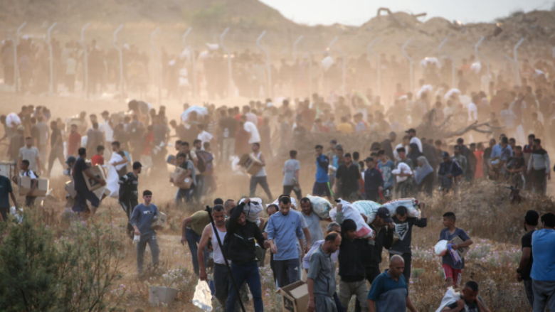 Pamjet e shpërndara në internet tregojnë qindra palestinezë që përpiqen të hyjnë në një qendër ndihme në Gaza, duke ngjitur një grumbull të madh dheu dhe duke u ngjitur në një gardh metalik. Pamjet janë...