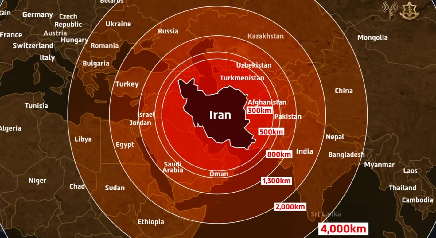 Forcat e Mbrojtjes së Izraelit (IDF) kanë publikuar një hartë ilustrative që paraqet rrezen e veprimit të raketave që aktualisht zotëron Irani. Në qendër të hartës ndodhet vetë Irani, ndërsa rreth tij...
