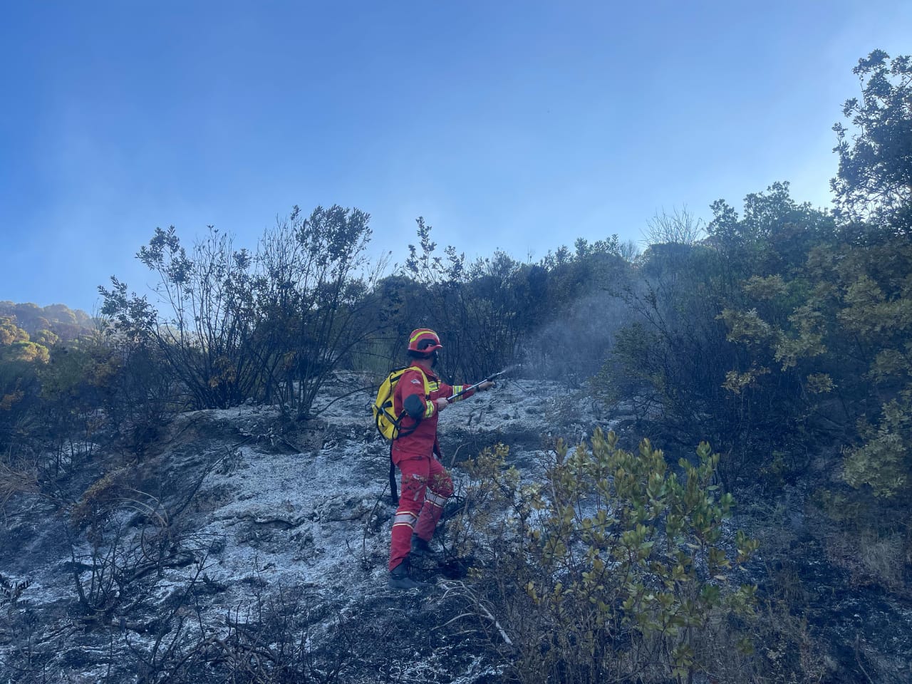 Forcat zjarrfikëse të Vlorës ndodhen prej orëve të para të ditës në malin e Dukatit, ku terreni i vështirë dhe malor e bën të pamundur ndërhyrjen me mjete. Zjarrfikësit po punojnë me lopata dhe degë pemësh...