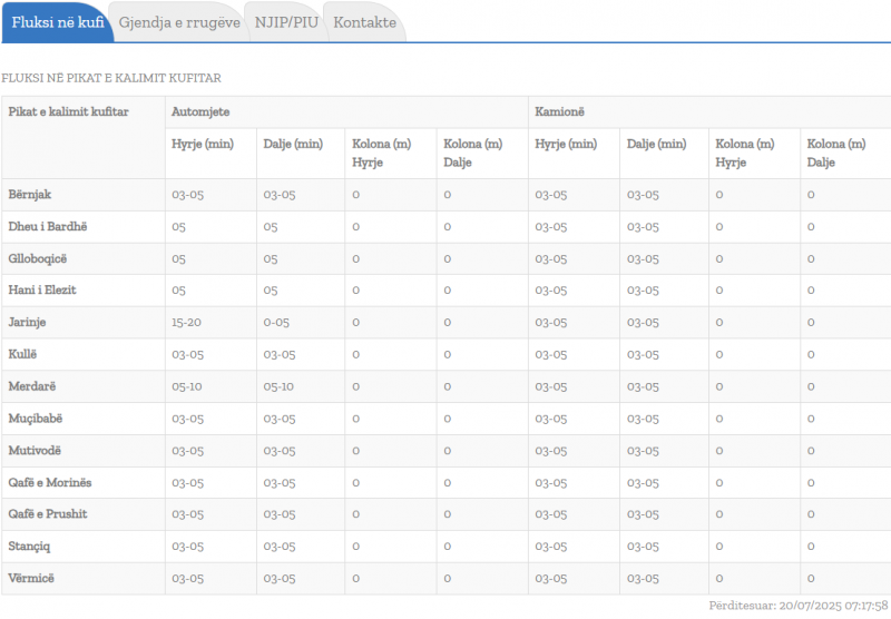 Kjo është gjendja në pikat kufitare 20 Jul, 8:01 Aktualisht nuk ka kolona as në hyrje e as në dalje në pikat kufitare. Pritjet nuk po zgjasin më shumë se 5 minuta. /Periskopi/
