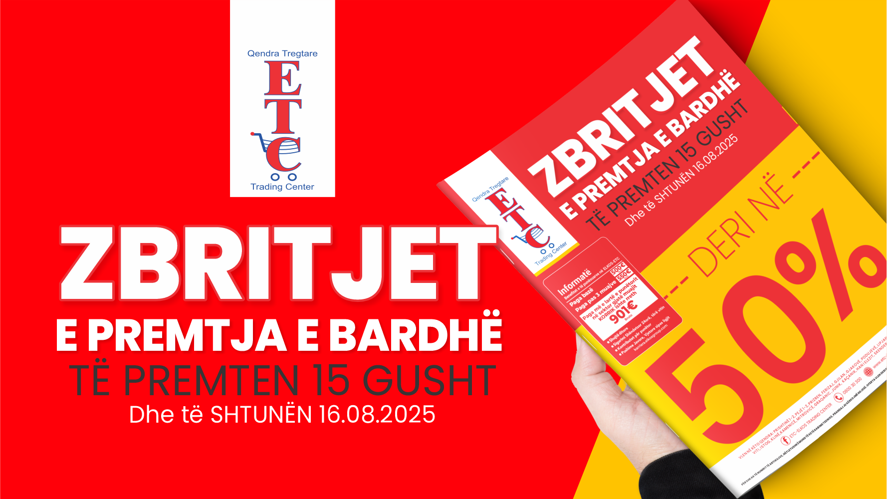 Përzgjedhje e gjerë në shumë artikuj kryesor me çmime të mahnitshme E PREMTË, 15 GUSHT dhe të SHTUNËN 16 GUSHT E PREMTJA E BARDHË është OFERTË e veçantë nga ETC me ZBRITJE DERI 50 % në shumë artikuj Shfleto Fletushkën Online:...