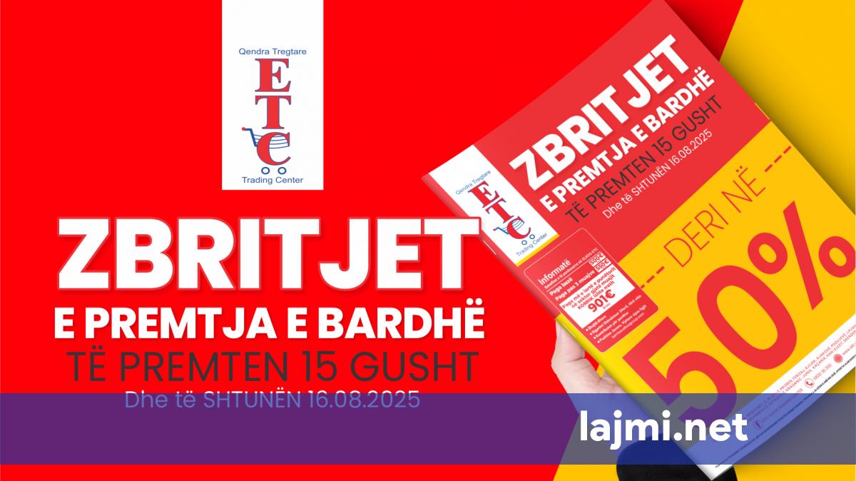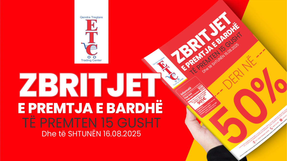 Përzgjedhje e gjerë në shumë artikuj kryesor me çmime të mahnitshme. E premte 15 gusht dhe të shtunën më 16 gusht. E PREMTJA E BARDHË është OFERTË e veçant nga ETC me ZBRITJE DERI 50 % në shumë artikuj....