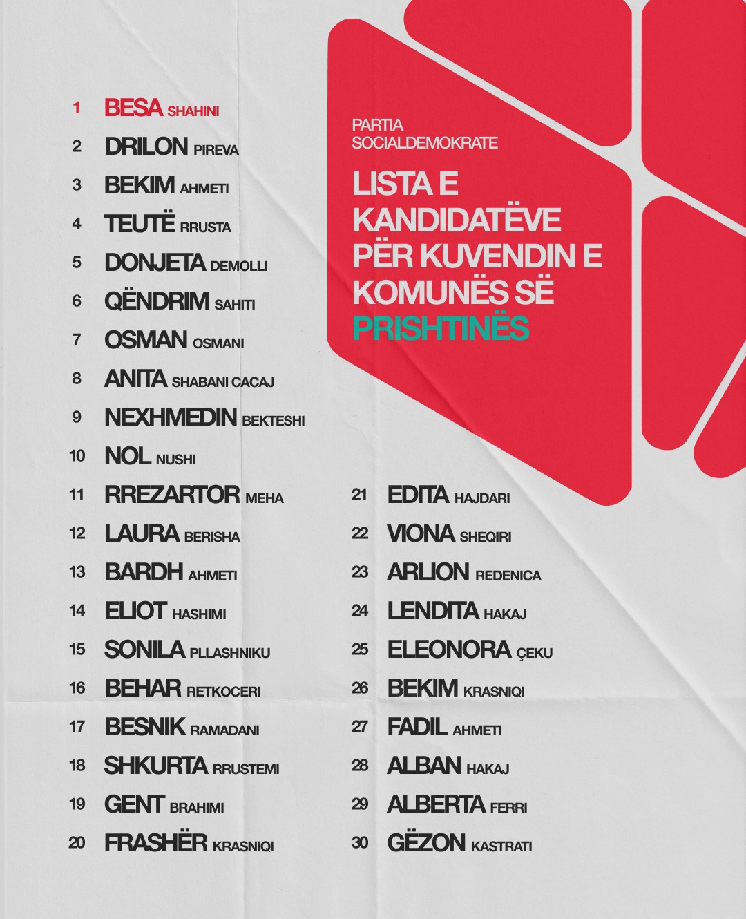 Partia Socialdemokrate e Kosovës ka publikuar listën e kandidatëve për Kuvendin e Komunës së Prishtinës. Në këtë listë prej 30 kandidatësh për asamblistë, prin kandidatja për kryetare të kryeqytetit, Besa Shahini.