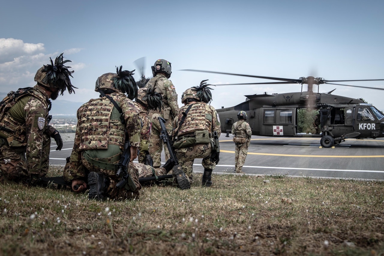 Ushtarët italianë nga Komanda Rajonale Perëndimore e misionit të KFOR-it, në koordinim të ngushtë me Aviacionin e Task Forcës së ushtrisë amerikane, kryen një stërvitje trajnimi MEDEVAC (evakuim mjekësor)...