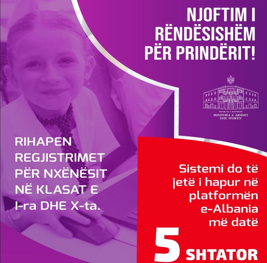 Ministria e Arsimit dhe Sportit ka njoftuar një lajm të rëndësishëm për prindërit dhe nxënësit e ardhshëm: më 5 shtator, do të rihapen regjistrimet online për të gjithë ata që do të nisin klasën e parë...