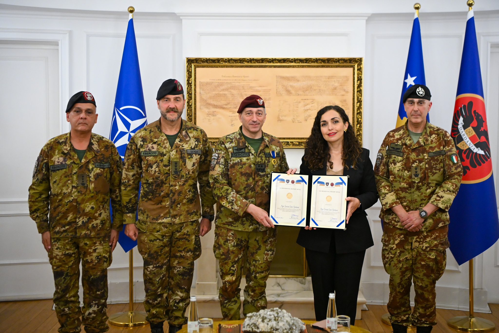 Presidentja e Kosovës, Vjosa Osmani, ka dekoruar gjeneralmajor Enrico Barduanin me Medaljen Presidenciale Ushtarake, në shenjë mirënjohjeje për kontributin e tij në paqe dhe siguri gjatë mandatit në krye...