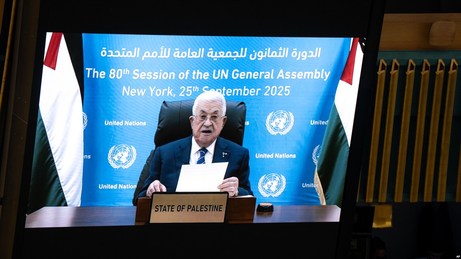 Presidenti i Autoritetit Palestinez, Mahmoud Abbas, mbajti një fjalim përmes një video-mesazhi në Asamblenë e Përgjithshme të OKB-së, pasi administrata Trump refuzoi t’i jepte vizë atij dhe delegacionit...
