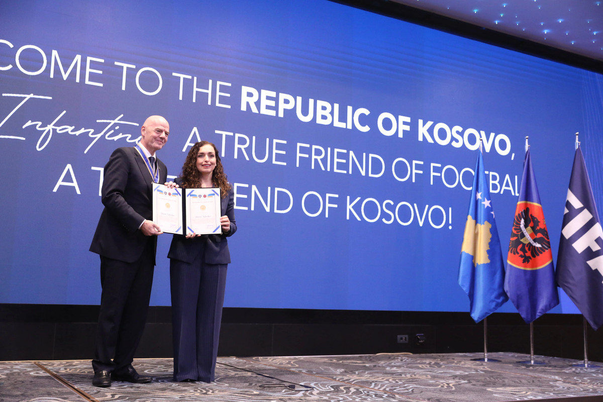 Presidentja e Kosovës, Vjosa Osmani e ka dekoruar të mërkurën presidentin e Federatës Botërore të Futbollit (FIFA), Gianni Infantino me medalje nderi për kontributin e tij në avancimin e rrugës së futbollistëve...