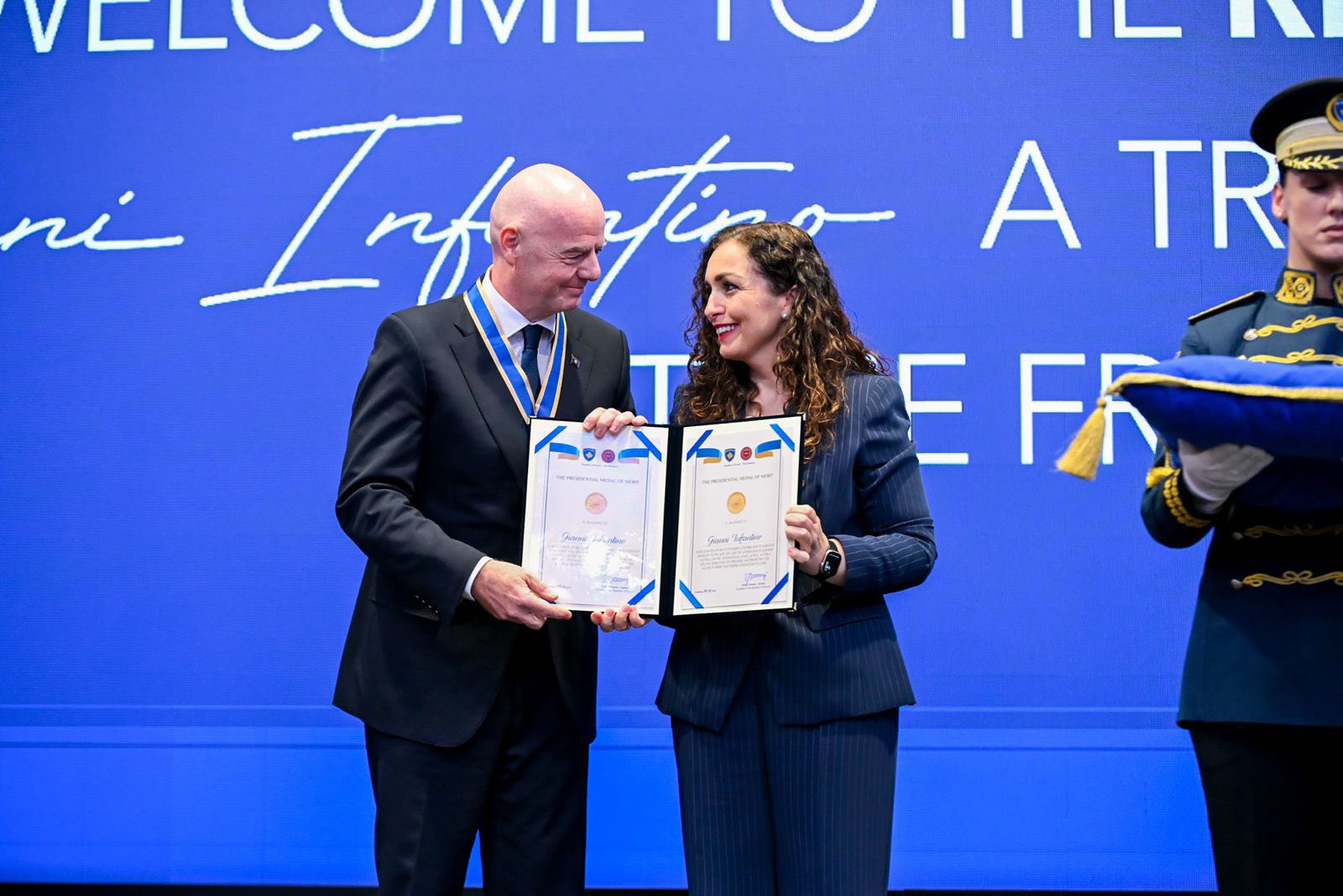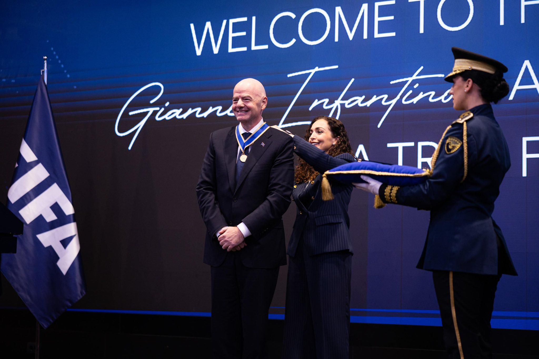 Presidenti i FIFA-s, Gianni Infantino është dekoruar nga presidentja e vendit, Vjosa Osmani. Ceremonia zyrtare po mbahet në një hotel në magjistralen Prishtinë – Ferizaj.