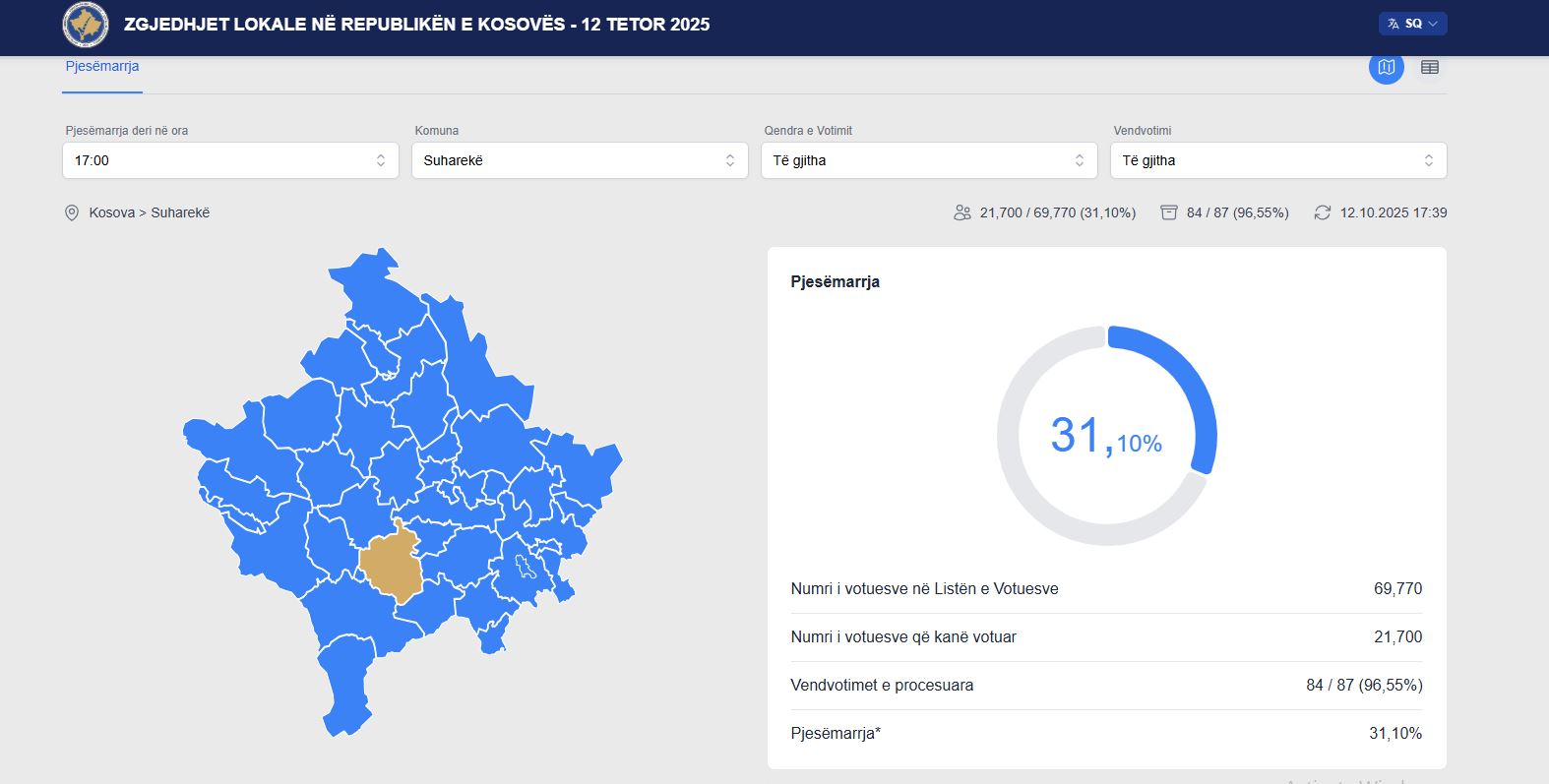 Edhe në Suharekë qytetarët kanë votuar për kryetarin e kësaj komune, në zgjedhjet lokale që po mbahen, raporton Gazeta Blic. Deri në ora 17:00, në këtë komunë kanë votuar 21.700 qytetarë apo 31.10 për qind. Më poshtë të dhënat: