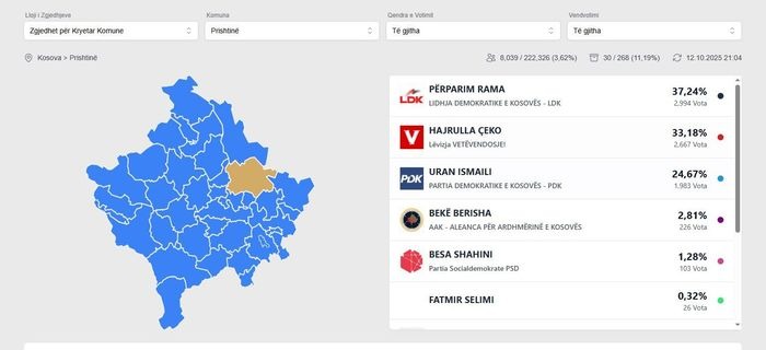 Komisioni Qendror i Zgjedhjeve po vazhdon me publikimin e votave për garën në Prishtinë. Nga 11.20 për qind e kutive të numëruara, Përparim Rama vazhdon të prijë me 37.24 për qind, teksa i dyti është Hajrulla...