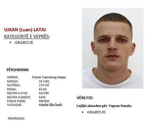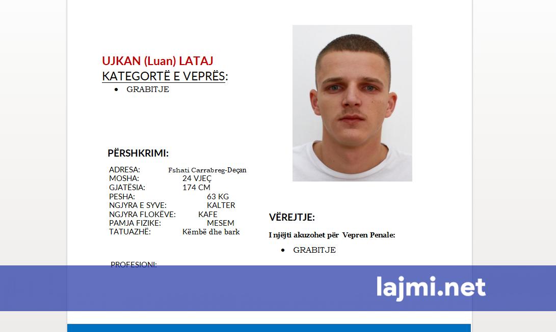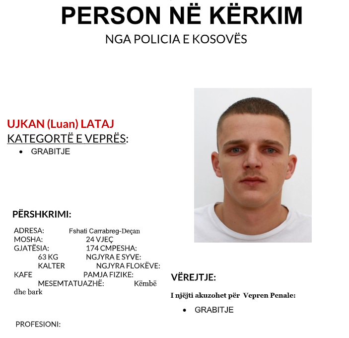 Policia rajonale e Pejës ka publikuar fotografinë dhe të dhënat e një eprsoni të kërkuar për “Grabitje”. Bëhet fjalë për Ujkan Luan Lataj, i lindur në vitin 2001 në Carrabreg të Deçanit. “Policia e Kosovës...