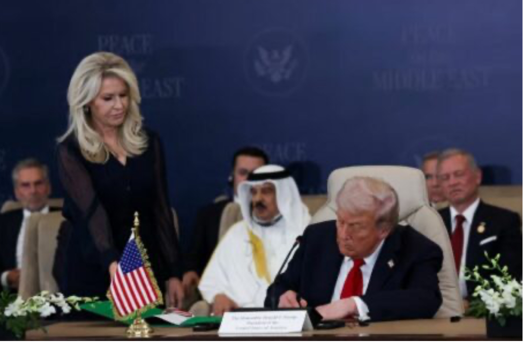 Presidenti Donald Trump dhe udhëheqësit në Lindjen e Mesme nënshkruan të hënën atë që e kishin përshkruar si një marrëveshje historike armëpushimi. Një imazh i kapur nga një fotograf në dhomë jep një ide...