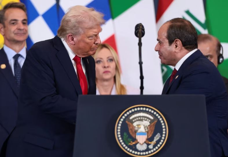 Presidenti i SHBA-së, Donald Trump, dhe Presidenti i Egjiptit, Abdel Fattah el-Sisi, folën shkurt me shtypin pasi Trump mbërriti në qytetin egjiptian të Sharm El Sheikh për një samit paqeje me dhjetëra...