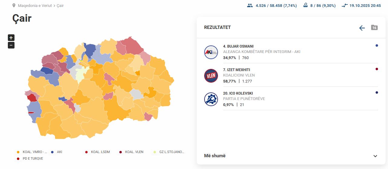 Janë publikuar rezultatet e para nga numërimi i votave në komunën e Çairit, shkruan Alsat. Nga këto rezultatet shihet se VLEN tani për tani është duke prirë ndaj AKI-së.